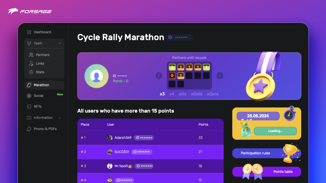 Every Forsage user is a potential contestant. Just keep inviting new partners, activating levels and completing them. During the rally time period each completed level will bring you points. Collect at least **15 points**, and you will automatically become a participant of the rally. Complete more levels to earn more points and increase your chances to win!